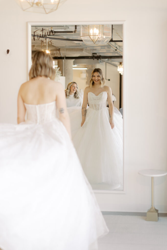 3. Boutique experience. Elevated, warm, and personal. When you walk through our doors, you’re not just another appointment, you’re the star. Our boutique in Downtown Green Bay brings the luxury of big-city bridal shops to Northeast Wisconsin. We pair that with heartfelt hospitality: stylists who listen, a relaxing environment, and touches (champagne, comfy dressing rooms, thoughtful guidance) that make dress shopping feel special rather than stressful.